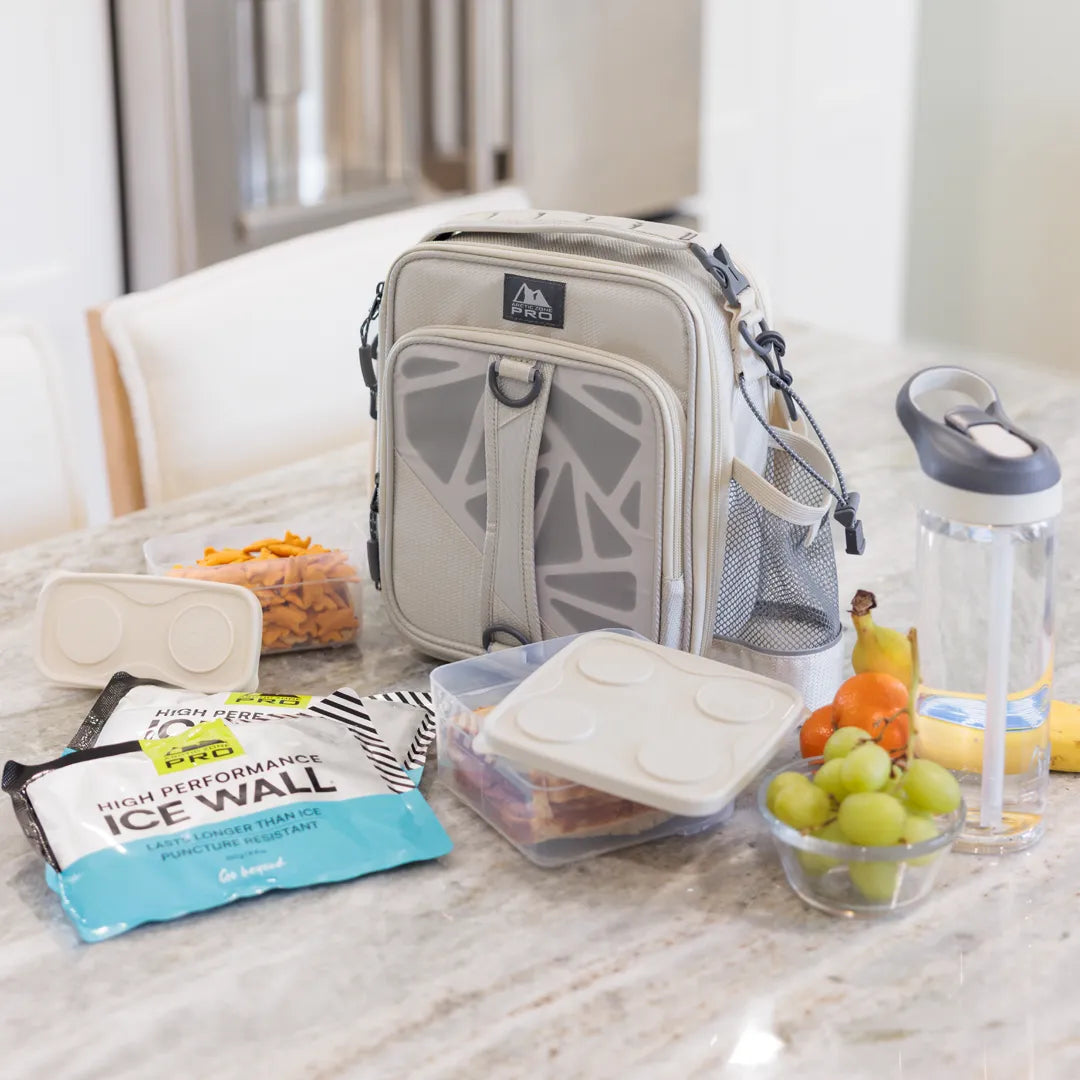 - Insulated lunch bag includes a connectable sandwich and snack container, two high performance Ice Walls® and Tritan bottle